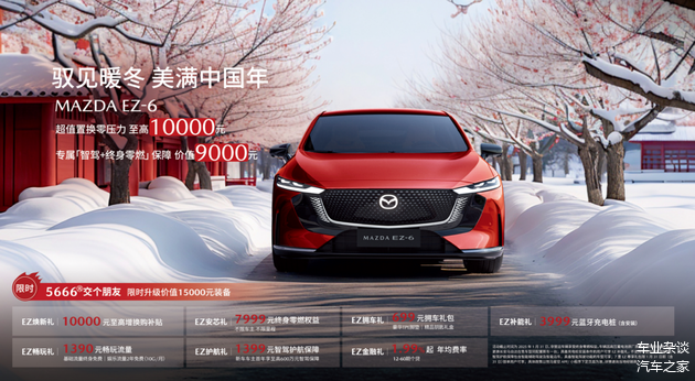 此外,截止2025年1月31日,进店下订燃油车型可享25元抵2,025元,次世代MAZDA3昂克赛拉2.0L自动档8.99万起,MAZDA CX-30 2.0L售价9.99万起,MAZDA CX-5 2.0L舒适型限时售价11.58万起,MAZDA CX-50行也2.5L车型限时15.88万起;MAZDA EZ-6享8重礼,花5,666元可限时升级价值15,000元装备。
