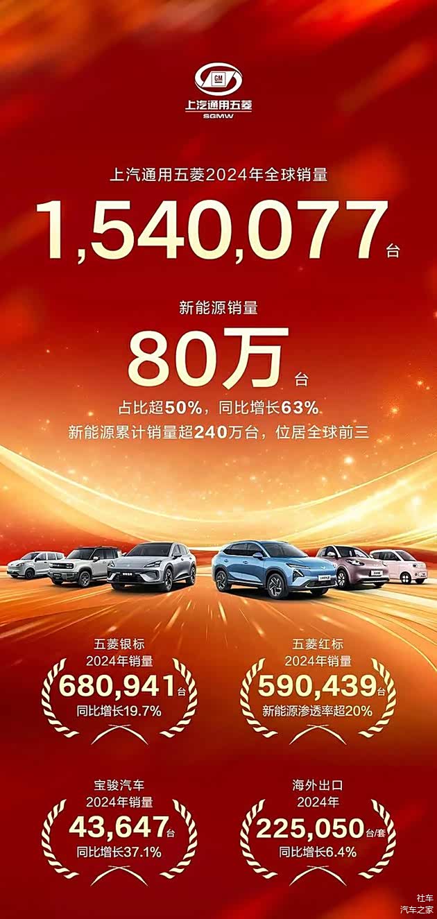 回顾 2024 年,五菱的表现堪称惊艳全场。新车销量如同一匹脱缰野马,一路狂奔至 154 万辆,其中新能源车型更是大放异彩,销量突破 80 万辆,累计新能源销售记录成功跃升至 240 万辆以上。这一成绩犹如一记响亮的耳光,扇在了那些质疑中国新能源汽车实力的人脸上,也让五菱在新能源领域站稳了脚跟。与此同时,五菱在海外市场也毫不示弱,以 22.5 万台 / 套的出口佳绩,成功刷新了品牌的历史记录,将中国汽车品牌的荣耀带向了全球。