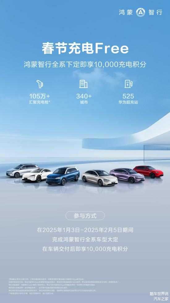 此外,品牌推出了春节充电Free 活动,鸿蒙智行全系下定即享10000充电积分,该积分可在鸿蒙智行App充电服务内任一支持积分充电的充电站抵扣部分充电费用(含充电服务费),也可用于精选频道购物抵扣部分金额。