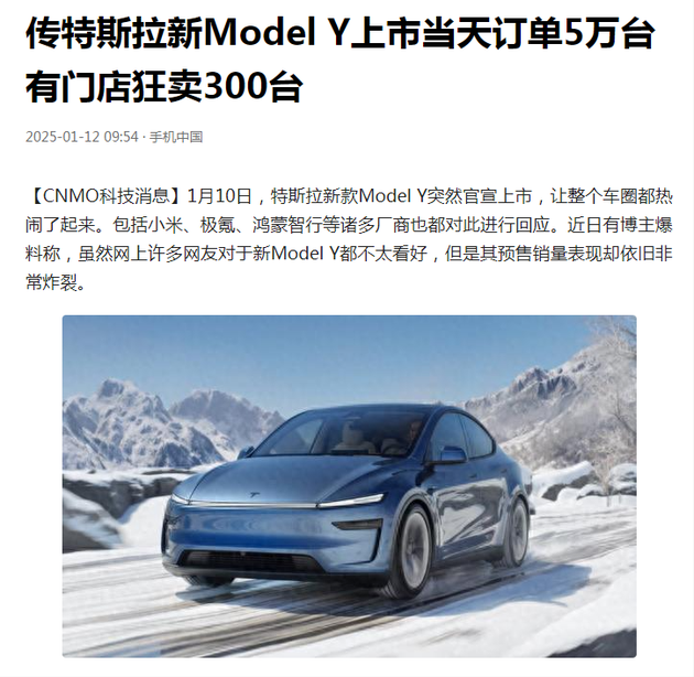 新款Model Y的发布引起了广泛关注。据手机中国报道,发布当天,特斯拉中国官网的微信官方推文在短短5分钟内阅读量就突破了10万。有特斯拉销售人员向财联社记者透露,当天的订单量“爆了”,尽管老款Model Y有一定的价格优惠,但选择新款Model Y的顾客仍然更多。还有销售人员在社交媒体上分享称,门店在1月10日当天接到了近300个订单,可见新款Model Y的受欢迎程度。
