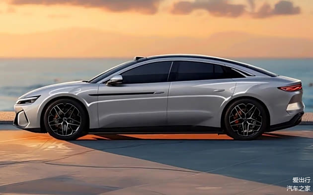 车侧部分,通过效果图我们可以清晰地看到,汉L采用了“大溜背”式的轿跑造型。车顶到车尾之间的线条过渡自然流畅,营造出一种蓄势待发的俯冲感。细节方面,车顶配备了激光雷达,预示着新车将搭载比亚迪的“天神之眼”智能驾驶辅助系统。隐藏式门把手的设计既美观又实用,而一道黑色饰条从前翼子板处一直延伸到前门把手处,为车身增添了几分神秘感。新车采用了五角星造型的轮圈,搭配红色刹车卡钳,进一步提升了车侧的运动氛围。