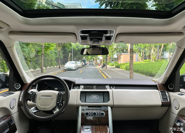 揽胜车内的整体配色和装饰板的图案都是偏向沉稳和商务的,四辐式的方向盘尺寸比揽胜运动版更大,转动圈数也更多,这也让转向手感更加模糊。不过 揽胜的真皮方向盘握感很好,表面的皮革细腻,柔软,让人爱不释手。