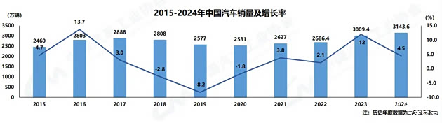 2024年,汽车产销累计完成3128.2万辆和3143.6万辆,同比分别增长3.7%和4.5%,全年产销稳中有进,产销量继续保持在3000万辆以上规模。销量规模创下历史新高,增速也实现了近年来较高的水平。