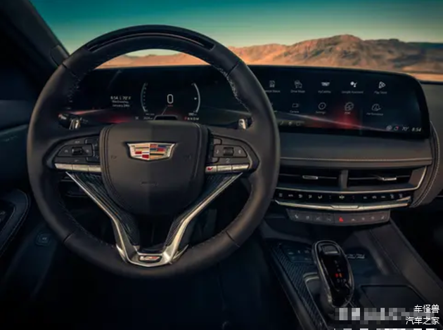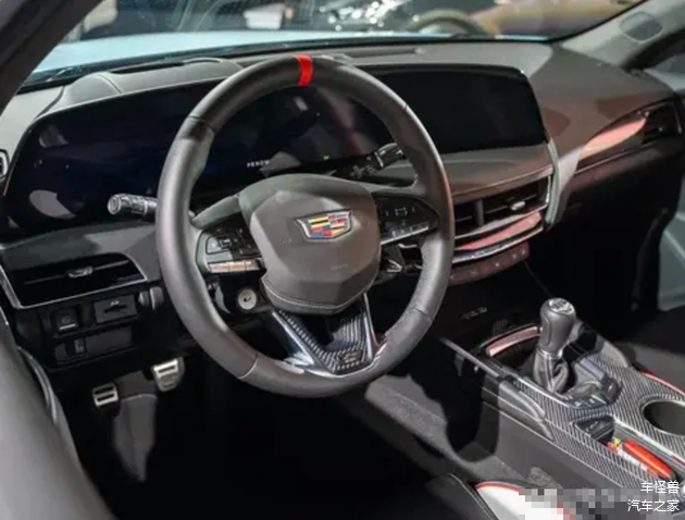 在2025款CT5-V的内部装饰方面,升级的焦点是全新的33英寸曲面双连屏。整个车内采用了黑色的配色方案,并且与普通版的新款CT5相比,在多功能方向盘上增加了红色的V运动模式按钮。