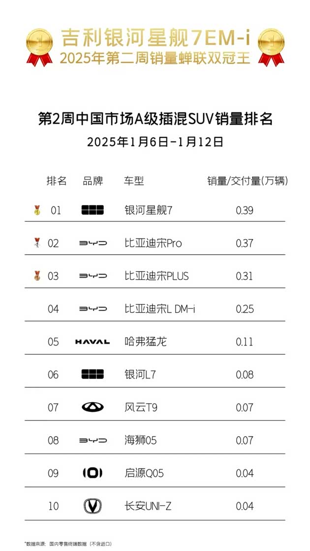 昨天各家车企又公布了自己的周销量数据,估计很多朋友和车卖家一样除了关注造车新势力的销量之外那就是非常关注吉利旗下几款爆款车型销量怎么样,从公布的周销量数据来看吉利银河星舰7 EMi蝉联了2025年第二周A级插混SUV市场销量冠军,同时也是1月份上半月的销量冠军,照这个势头下去吉利银河星舰7 EMi很有可能获得1月份插混SUV的销冠啊!