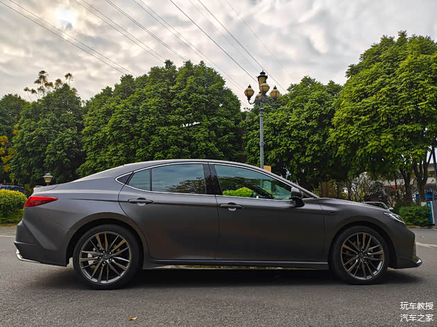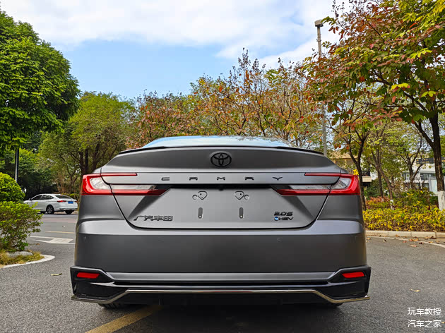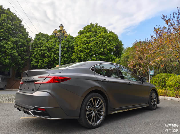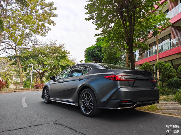 尽管光辉版不是真正的运动型车,但只要在路面上随便一停,整车的气场感就已经非常明显。以至于我们在拍摄的时候,不时有过往路人扭头看它,足以见得凯美瑞光辉版这套全身黑化+哑光漆+运动套件的实际效果之好。