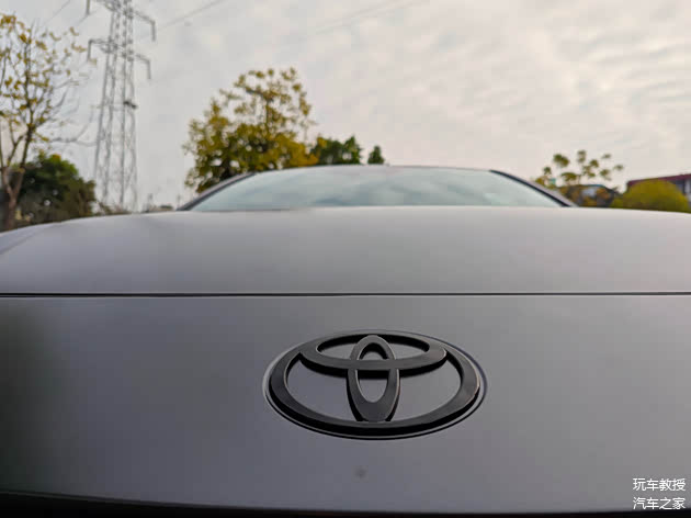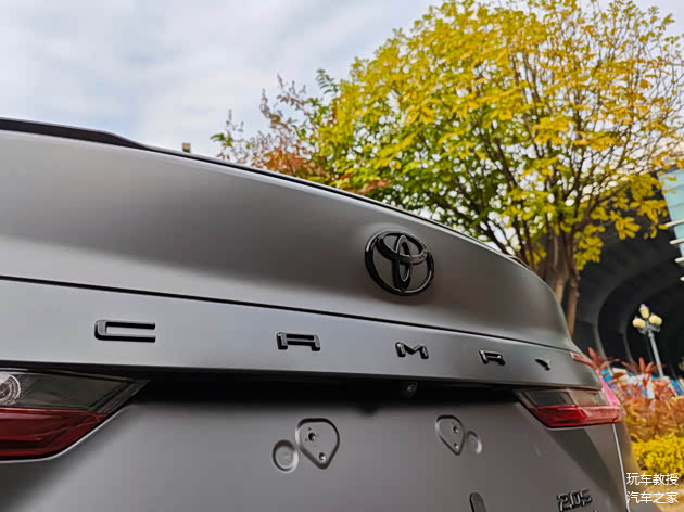 但车衣是用塑料基材料制造的,要做低砂感消光效果非常容易,但凯美瑞光辉版这可是实打实的原厂车漆。所以,凯美瑞光辉版这个哑光车漆是很有技术含量的。而且我们也可以看到,车子不止是做了哑光车漆,基本全车都做了黑化处理,丰田LOGO变成全黑版本,车尾的CAMRY标识也黑化了,甚至在车窗往里看都能看到,整个内饰也全部黑化处理。