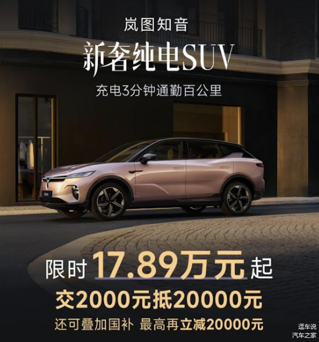 岚图知音作为一款中型高端纯电SUV,本次优惠后消费者以17.89万起的价格即可体验到越级配置。岚图知音不仅是同级别唯一800V高压碳化硅平台、拥有5C超充的纯电SUV,也是同级别唯一拥有901km超长续航的纯电SUV,这些配置在任何价格区间都是领先水平。加上得房率86.7%的超大空间、逍遥座舱、L2.9级智能驾驶辅助系统……强劲产品力加上“真香”的价格,岚图知音即将成为同级别纯电SUV的购车首选。