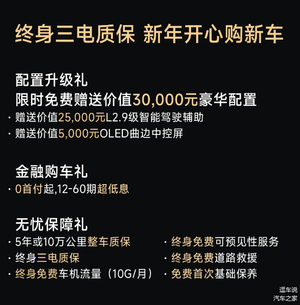 其中,配置升级礼包括免费赠送L2.9级智能驾驶辅助、OLED曲边中控屏,价值高达3万元;金融购车礼,包括0首付起、12至60期超低息,购车更轻松;无忧保障礼,囊括5年或10万公里整车质保、终身三电质保、终身免费车机流量(10G/月)、终身免费可预见性服务、终身免费道路救援、免费首次基础保养,涵盖养车用车等多个环节。三大好礼从选车购车起,就已经为用户的全用车周期,提供了省钱、省力又省心的用车体验。