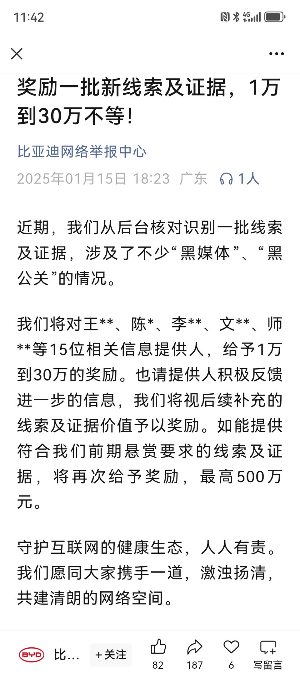 💭今日看到比亚迪网络举报中心的消息,感慨颇多。在这个信息纷繁复杂的网络时代,“黑媒体”“黑公关”如乱流涌动,扰乱视听。比亚迪此举,不仅是对自身品牌的维护,更是对网络秩序的坚守。奖励机制犹如一盏明灯,照亮了那些被阴霾遮蔽的真相角落,也唤醒了大众对网络健康生态的责任感。愿这星星之火,能燎原网络,让每一个信息都能在阳光下真实呈现,让我们的网络空间真正清朗起来