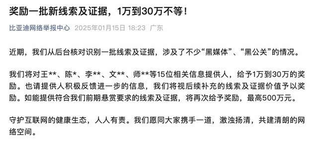 1月15日,比亚迪网络举报中心发布《奖励一批新线索及证据,1万到30万不等!》,对于15位相关信息提供人,给予1万到30万的奖励。表示了比亚迪对于打击黑公关的坚定决心。