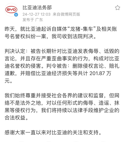 在各方的监督及线索提供下,比亚迪于2024年12月26日起诉自媒体博主“龙猪-集车”胜诉,此媒体长期针对比亚迪发表侮辱、诋毁的言论,并且存在严重歪曲事实的行为,构成对比亚迪名誉权的损害。法院判令被告删除侵权言论、赔礼道歉,并赔偿比亚迪201.87万元。