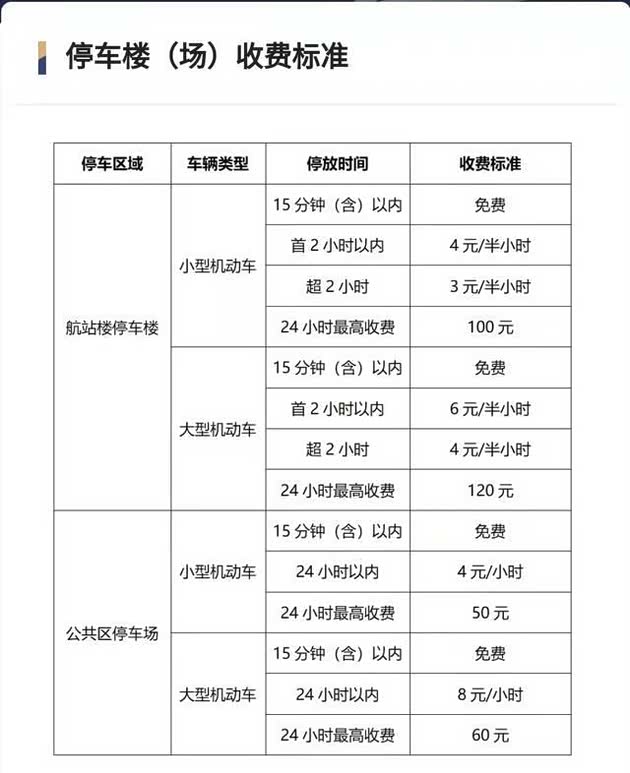 小型机动车:15分钟(含)以内,免费;24小时以内,4元/小时;24小时最高收费50元。