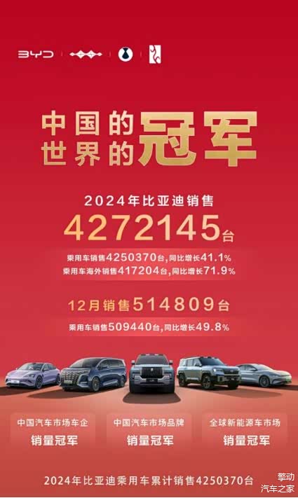 作为新能源的“一哥”,比亚迪的成绩真是属于遥遥领先级别的。据数据显示,2024年比亚迪销量达到4272145辆,是当之无愧的“冠军”,令一众友商望尘莫及。我觉得比亚迪卖得好,一是价格实惠的车型很多,二是推陈出新的速度很快,各个细分市场的车型几乎全都覆盖了。