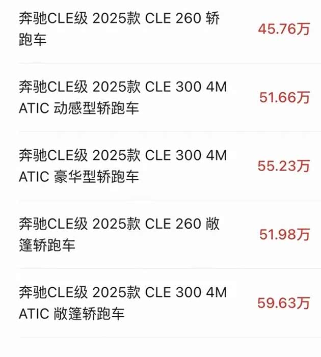 2025款奔驰CLE级提供5款配置车型,包含2款敞篷版车型和3款硬顶版车型,分别为:CLE 260轿跑车、CLE 260敞篷轿跑车、CLE 300 4MATIC动感型轿跑车、CLE 300 4MATIC豪华型轿跑车、CLE 300 4MATIC敞篷轿跑车,售价45.76-59.63万元。