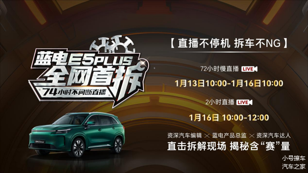 值得一提的是,为了让广大消费者更直观地了解蓝电E5 PLUS,日前,蓝电产品总监x资深汽车编辑x资深汽车达人进行联动,用3天72h公开直播,将一台崭新的蓝电E5 PLUS大卸八块,并进行了2小时全方位专业解读。