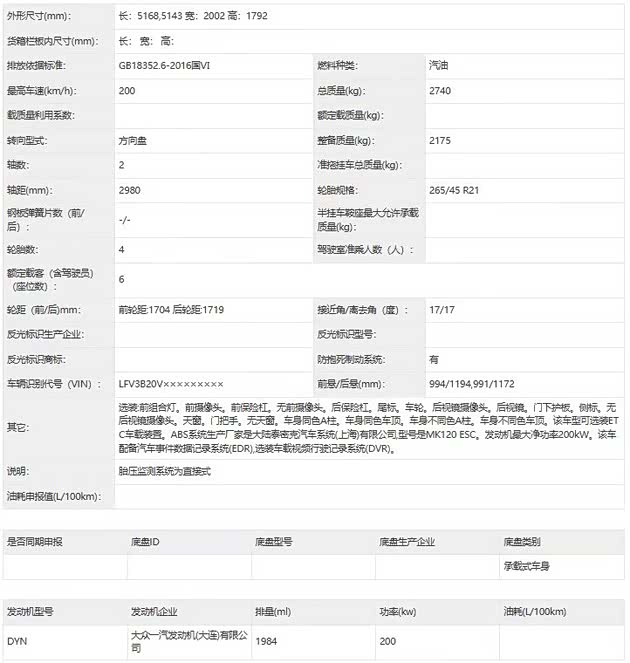 除了外观的明显变化,本次申报信息也透露了新款揽境的动力参数。