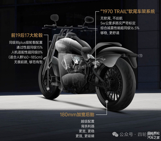 就是因为418采用的是内置避震的软尾车架,这种设计对比主流巡航车,少了两根后减震,在路人第三视角下,简洁的车尾会更加凸显后轮180大宽胎的霸气!所以即便这是一台400CC的巡航车,但在视觉效果上已经与公升级巡航相当!
