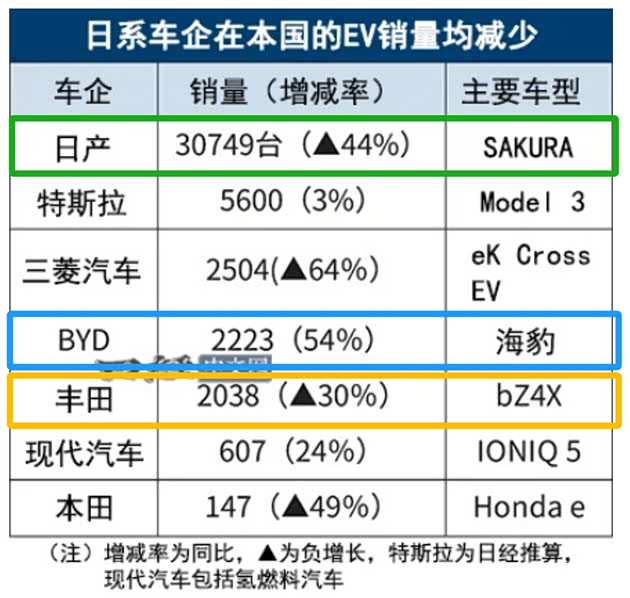 排第一位的日产2024年销量30749辆,远高于比亚迪的2223辆和丰田的2038辆,但日产是以日本特色的轻自动车为主(尺寸比海豚小,价格也比海豚低)。