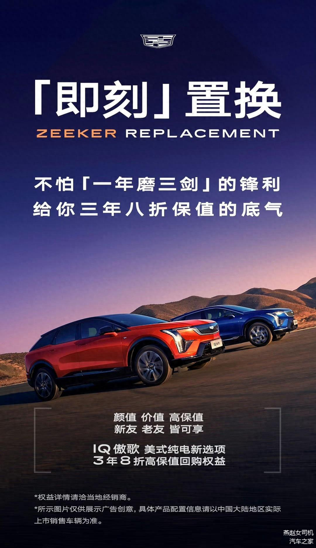 相似的营销还发生在2024年8月中旬,彼时极氪深陷更新换代风波,凯迪拉克又发布一张“内涵”极氪的海报,其标题部分所写的“即刻置换”对应英文单词“ZEEKER”,与极氪的英文名称“ZEEKR”仅差一个字母,而“不怕一年磨三剑的锋利,给你三年八折保值的底气”的内容也明显在“阴阳”极氪。