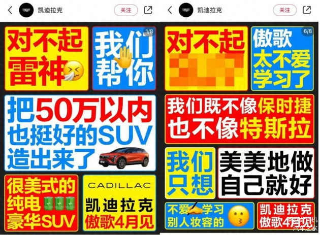到了2024年,凯迪拉克在宣传第二款纯电车型IQ傲歌时,再次“翻车”——“对不起雷神,我们帮你把50万元以内也挺好的SUV也造出来了”、“傲歌太不爱学习了,我们既不像保时捷,也不像特斯拉”……这分明是在嘲讽小米SU7。形成对比的是,小米SU7全年销量累计突破13万辆。