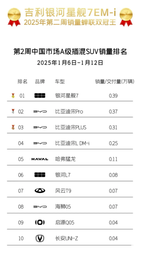 从最新销量数据来看,吉利银河星舰7EM-i在2025年第二周成功卫冕A级插混SUV市场销量冠军,并且稳坐1月份上半月该细分市场的销量头把交椅。照此强劲势头,拿下1月份插混SUV的销冠几乎是板上钉钉之事。