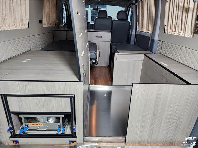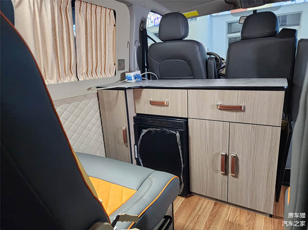 进入车内,亚星大通V80pro露营车的内饰布局既实用又便捷。中滑门一侧的定制版折叠座椅,在驻车时还能前折叠变成茶台,无论是品茗聊天还是放置生活用品,都显得得心应手。