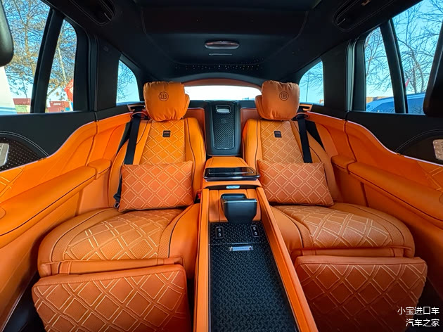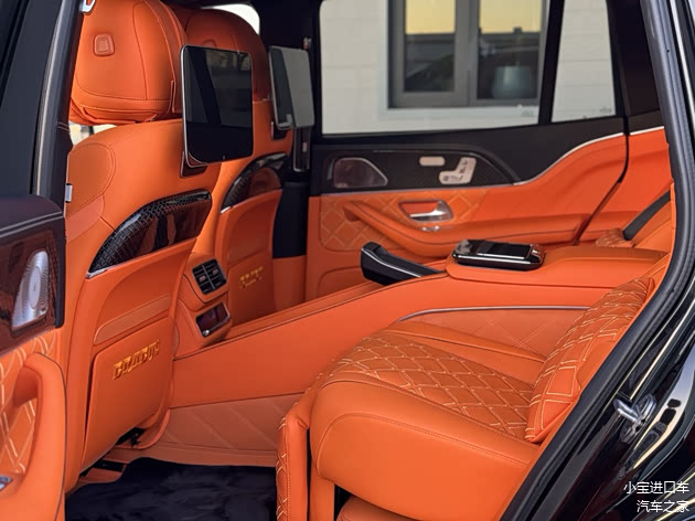 前后门板采用爱马仕橙色菱形格皮子带有巴博斯logo烫印,座椅上带有巴博斯签名标牌,主副驾驶座椅靠背巴博斯logo刺绣。后备箱盖板带有巴博斯logo刺绣