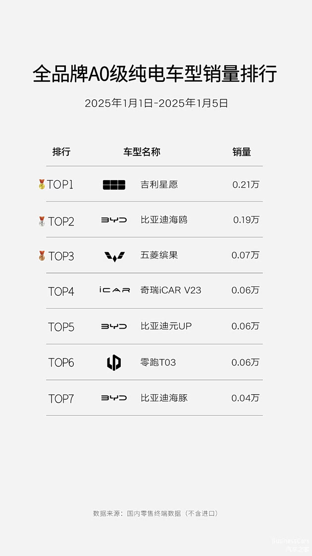 进入2025年后,吉利银河继续保持着强劲的增长势头。新年第二周(1月6日至1月12日),吉利银河凭借旗下多款车型的强大竞争力,再次登顶多个细分市场的销量榜。其中,吉利银河星舰7EM-i荣获全品类混动车型及A级插混SUV市场的双料冠军,而吉利星愿则同时夺得了全品牌纯电轿车与A0级纯电轿车市场的榜首位置。