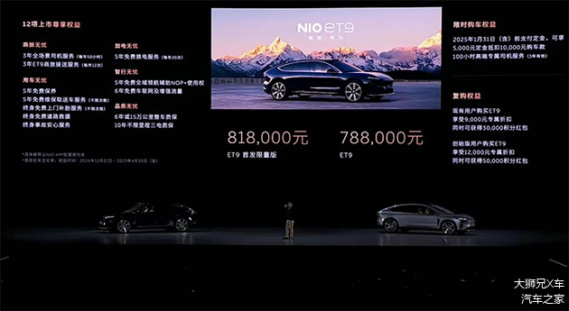2024年年底,全新蔚来ET9正式上市,标准版车型售价78.8万元(用BaaS电池租赁方案后价格为66.00万元),新车即将在2025年3月份开启交付。新车是蔚来10年的造车技术结晶,代表着家族电动车面向未来的全新突破。