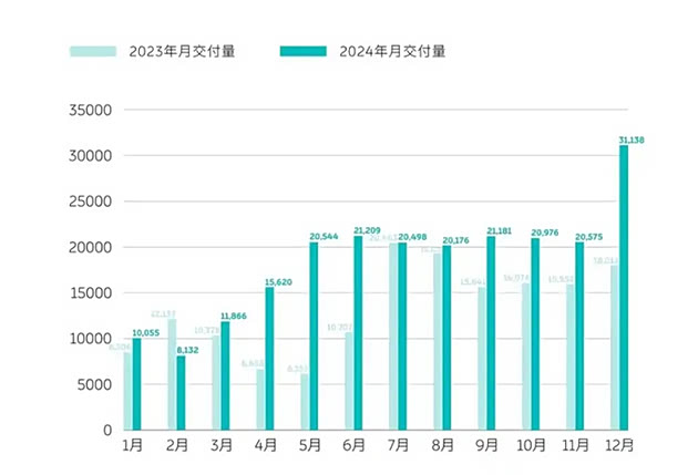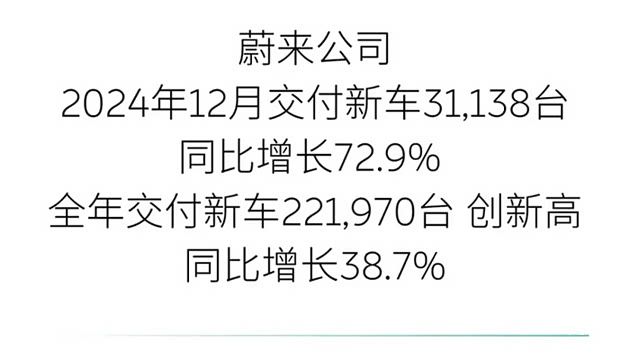 开年首日,蔚来汽车便公布了相关销量数据,蔚来汽车在去年12月份累计交付新车3.11万辆,环比增长51.3%,单月交付突破3万辆新高;而纵观2024年全年,蔚来汽车累计交付了22.19万辆新车,同比增长38.7%。