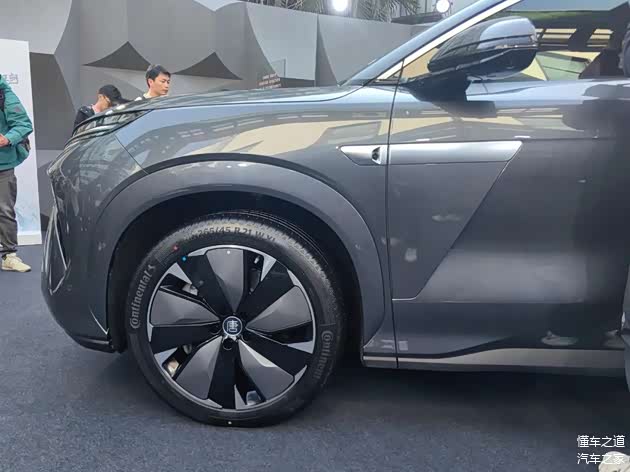 来到车身侧面,圆润的车身线条,肩线笔挺,分段式造型裙边,配备隐藏式门把手。车身尺寸方面,其长宽高分别为5040/1996/1760mm,轴距为2950mm,配备21英寸低风阻轮圈。