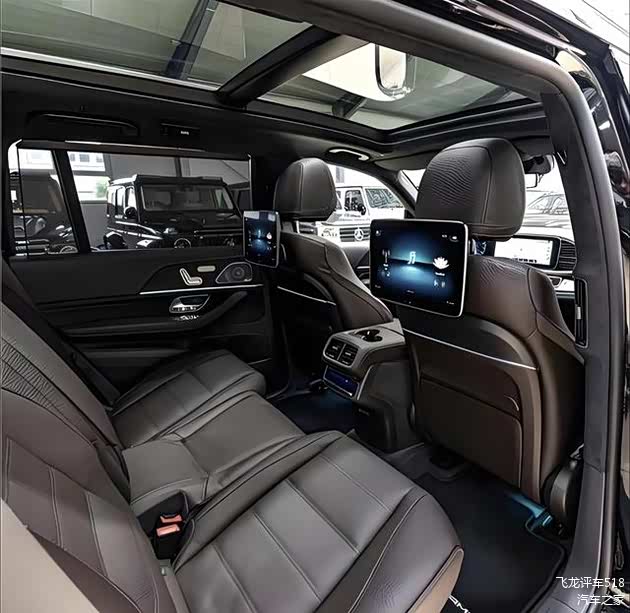 梅赛德斯二次改款后的GLS车身变得更加方正、古典,车顶线条更加平直,还加入了黑色全尺寸行李架,车窗边缘也加入了黑色装饰条点缀,黑色的A柱、B柱、C柱、D柱也增添了更多的时尚气息,营造出悬浮式车顶的立体感。双腰线都呈现出前低后高式的设计,配合着电动迎宾踏板,也呈现出俯冲的姿态。21英寸的多辐式/锅盖式/五星轮毂搭配着275/45、315/4的宽胎,再加上电动迎宾踏板、迎宾光毯,运动感十足。车身尺寸方面,参考现款车型,车辆长宽高分别为5208/2030/1838mm,轴距为3135mm。配备的真皮沙发座椅带有多向电动调节、腰部支撑、腿托调节,并支持座椅加热/通风,旁边还带有加热/制冷的杯架,还有后排小桌板、中央扶手箱操控显示液晶屏、无线充电,后排乘客可直接控制MBUX多媒体娱乐系统。多喇叭的Burmester柏林之声高级音响、128色氛围灯,也更加舒适。