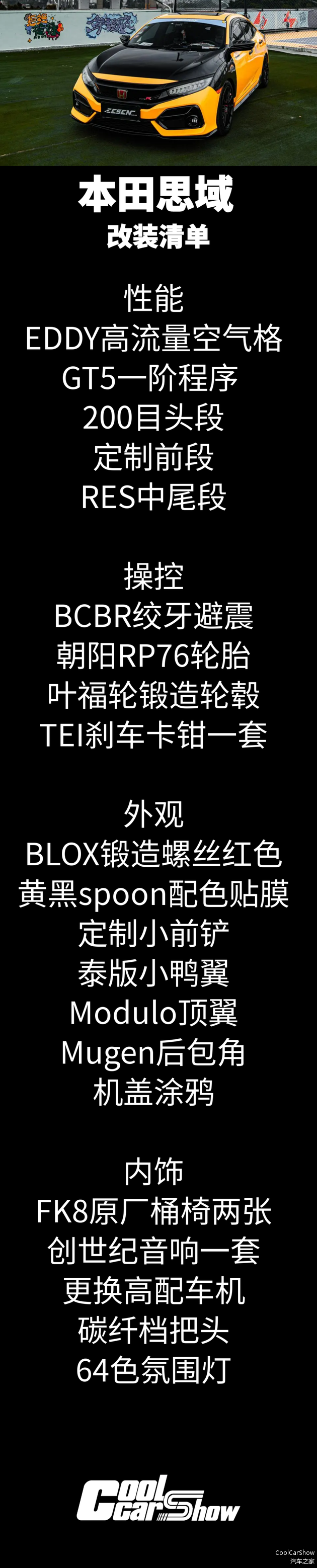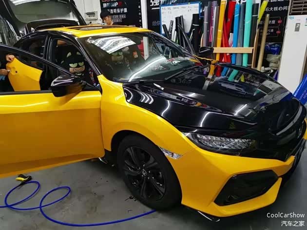 “改装其实没有太多思路,都是一步步来的,首先就是这一身黄黑配色,其实源自于一位泰国车友改出来的Spoon黑黄效果图,我也是找了好久才找到合适的黄色。”