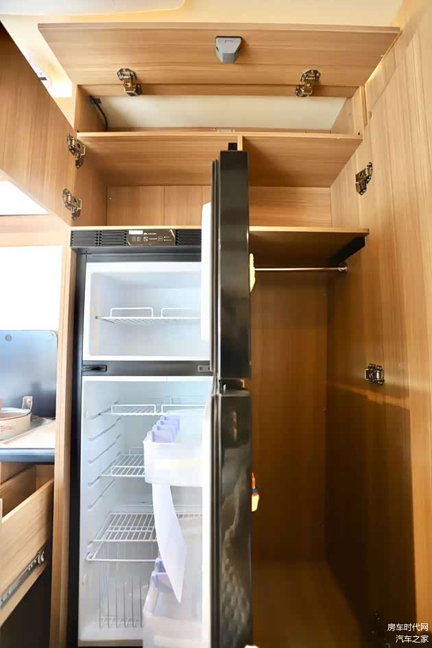 厨房区配置有洗菜池、电磁炉、96L双开门冰箱,配合车外便携式柴油炉,满足了用户丰富的制餐需求。