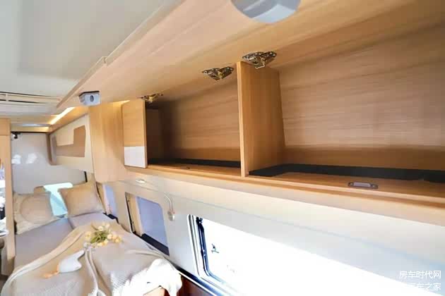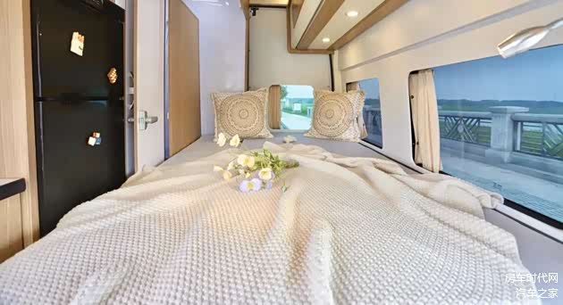 车辆尾部一侧为本车的床铺区域,固定床板尺寸为0.9×2m,休息时可以利用卫生间的门板进一步的拓展床铺空间,整体可以变成一张1.3m的双人大床。
