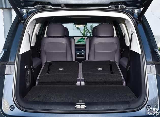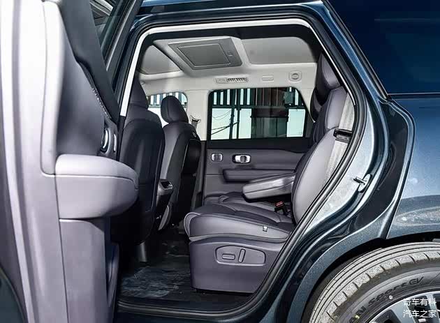 既然大家奔着空间去的,我们就先来了解一下新车的空间体验。新车尺寸为4915/1905/1770毫米,轴距为2825毫米,采用了2-2-2的布局,定位5门6座SUV。前排座椅,配有加热通风功能,主驾驶还有记忆功能。二排是独立座椅,支持前后和靠背调节,拥有加热通风功能,并配有小桌板,还能控制前排副驾座椅移动。三排座椅支持靠背调节和比例放倒,座椅宽度为1036毫米,座椅深度为460毫米,座椅到顶棚空间高达947毫米,并拥有160毫米的中央通道。此外,后备箱在满员的情况下还能放两个24英寸的行李箱,三排座椅放倒之后空间可达1022升,搬家拉货也不在话下。