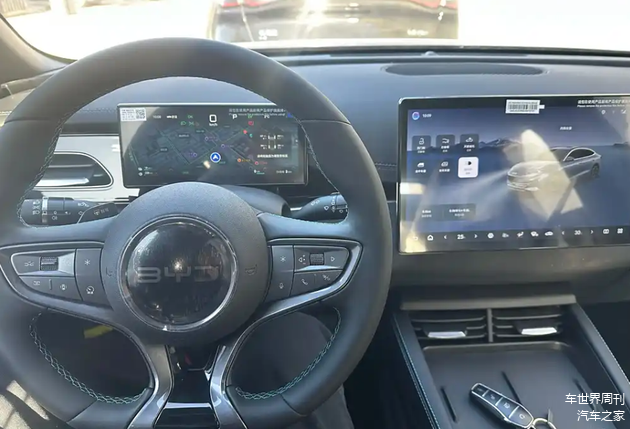车内部分,2025款海豹06的整体布局没太大变化,依然是我们熟悉的海洋网设计风格,比如8.8英寸矩形液晶仪表+自适应可旋转悬浮Pad、鱼尾造型多功能方向盘、“海洋之心”控制中枢、水晶拨片电子挡杆等,营造出不俗的时尚感和科技感。