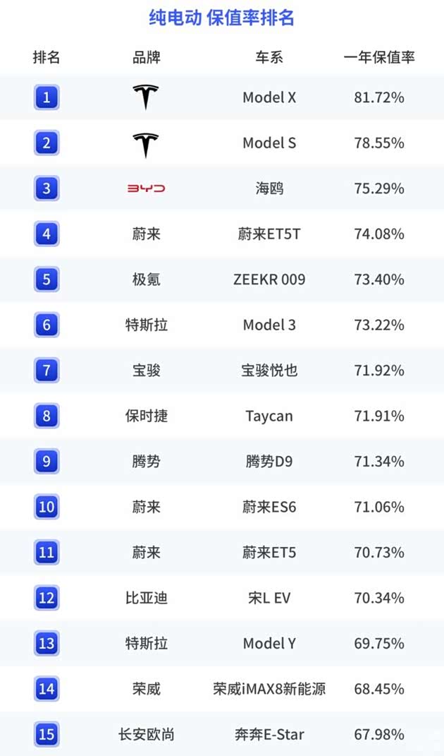 都说电车不谈保值率,因为前几年纯电动汽车在二手市场根本卖不动,不少车商收电车回来后都是亏本转卖。然而随着电车的保有量越来越大,如今很多车型还是比较保值的,近日中国汽车流通协会发布了2024年纯电动汽车保值率排行榜,具体情况如下: