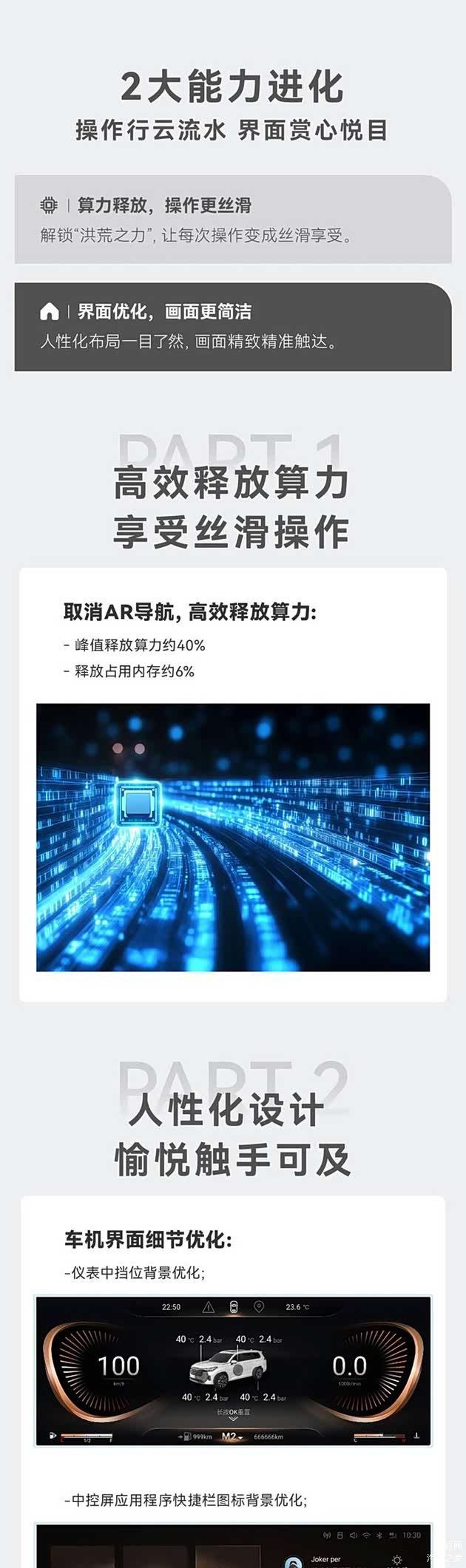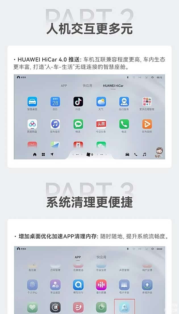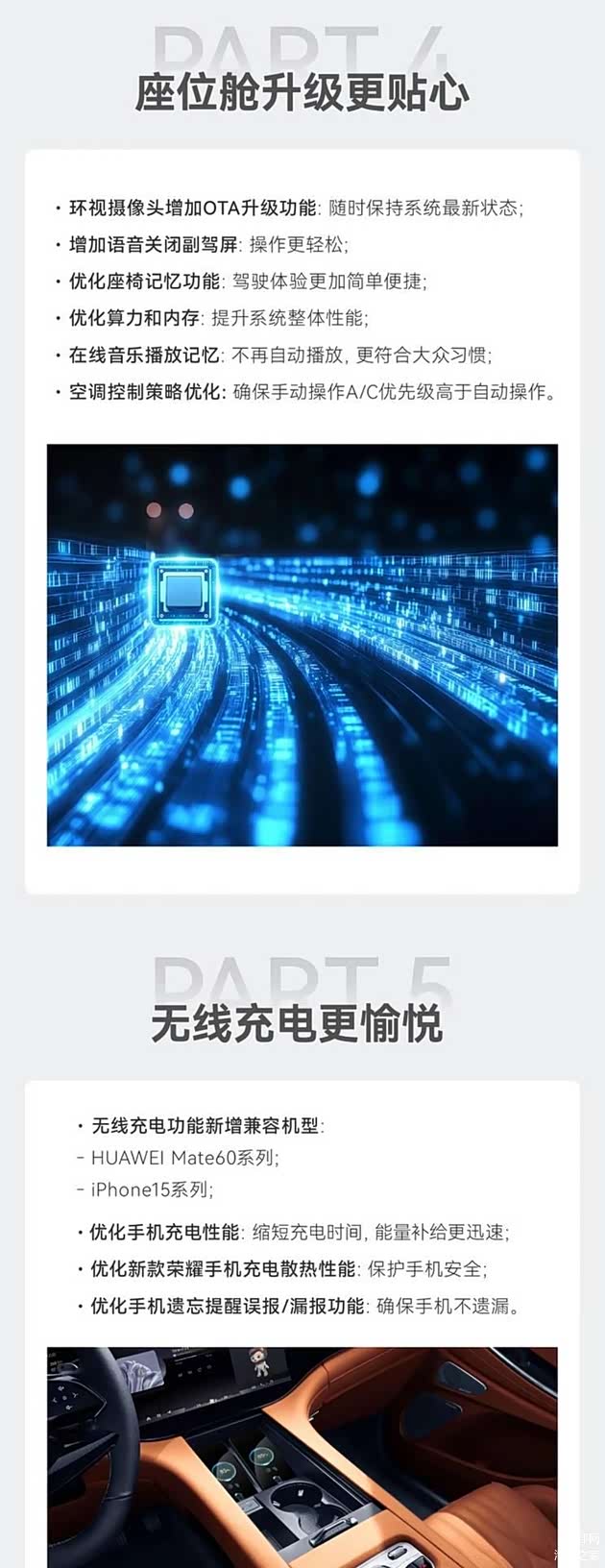 而对于搭载8155座舱的2023款、2024款及2025款车型,此次OTA升级则更为全面,涵盖了五大能力的提升和24项用户体验的优化。在智能驾驶方面,NOC高速导航辅助驾驶功能新增支持39个城市,同时APA自动泊车系统的性能也得到了优化。人机交互方面,新增了HUAWEI HiCar 4.0的推送,桌面优化加速App、环视摄像头的OTA升级功能、语音关闭副驾屏功能以及无线充电功能的兼容机型也得到了增加。