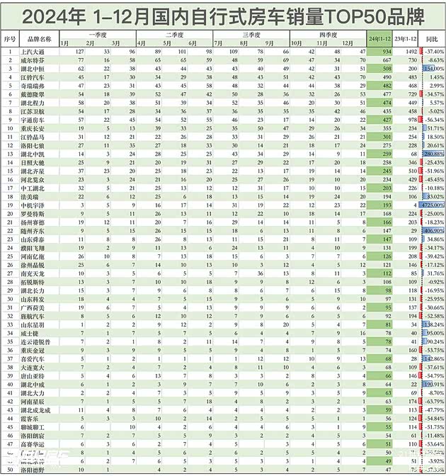 2024年中国房车市场在挑战中前行,虽然整体销量有所下滑,但各品牌之间的竞争依然激烈。以下是根据现有数据整理的销量TOP50的部分情况: