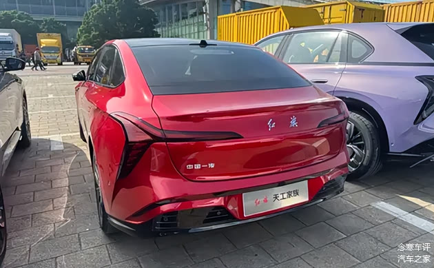 车尾部分,天工05的尾灯组采用了红旗新能源车家族化的L形设计,看起来还是比较协调的。另外,后保险杠上设计了牌照框,这与概念车还是有些区别的,也让尾部层次感更强。