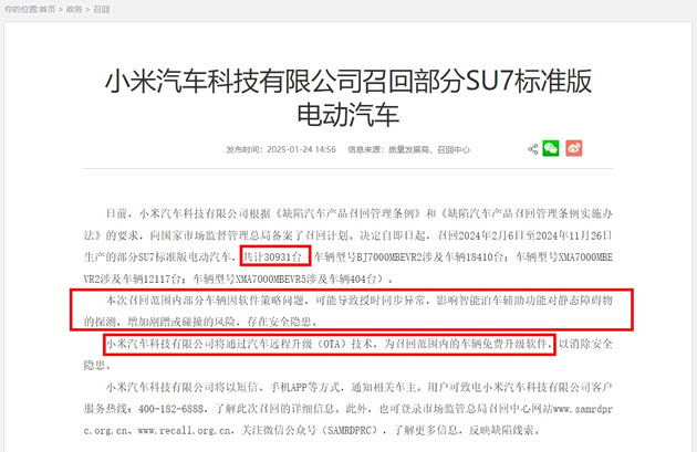 这次召回的是部分小米SU7标准版车型,生产日期从2024年2月6日到2024年11月26日期间,共计车辆30931辆。