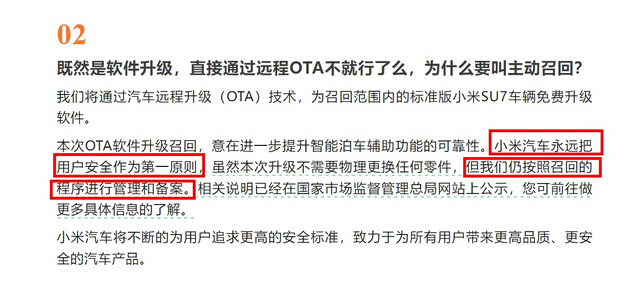 原因是,小米官方在召回声名中着重强调,这次是主动召回。而言外之意似乎也就是在说,我本可以不召回,但因为小米汽车永远把用户安全作为第一原则,所以我们才主动进行了召回。以下是具体的官方原文: