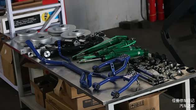 来到底盘方面,因为底盘状态比较差,所以对悬挂系统进行全面更新+升级,更新一套刹车盘皮、升级一套TEIN避震器、更换一些原厂摆臂、球头、拉杆,升级前后防倾杆,升级可调倾角后摆臂等等。