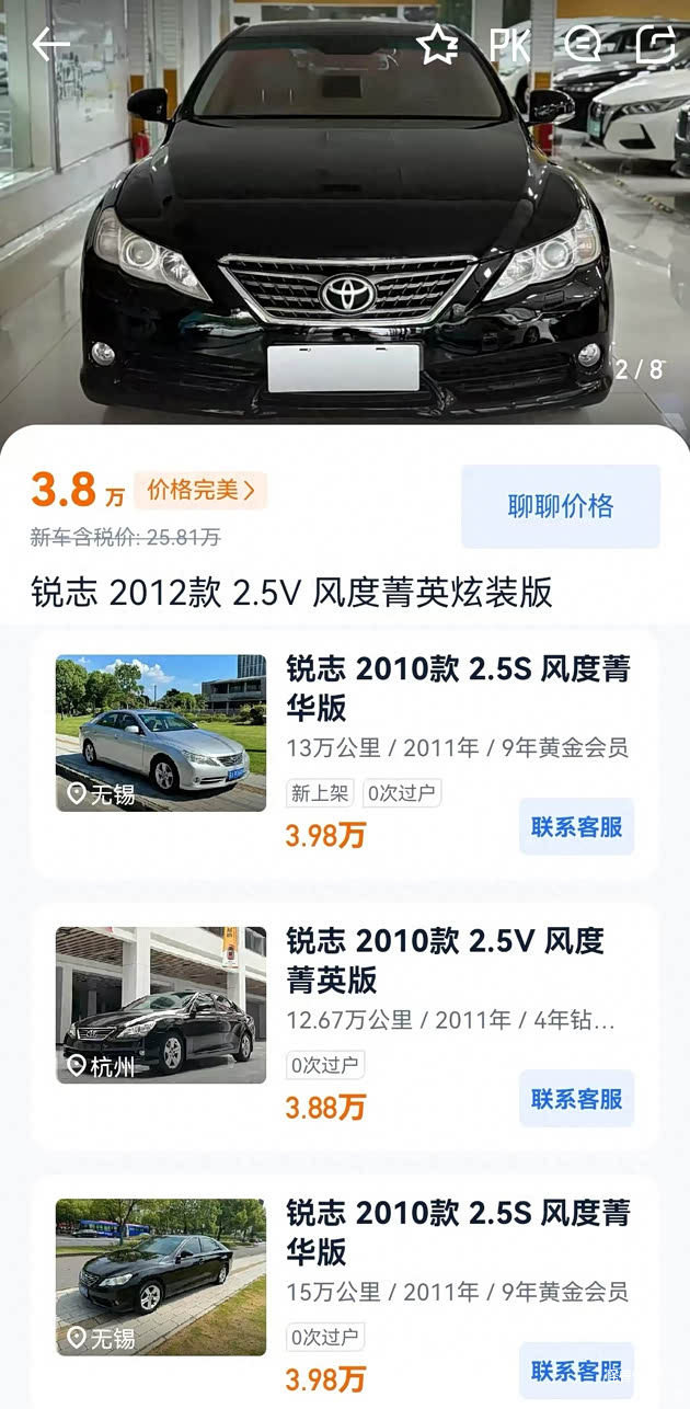 先说说2010款丰田锐志吧,当年落地26万,现在二手车还能值个3万左右,对于老 锐志,我觉得算是辆好车,当时属于家用级别轿车、运动属性、操控、舒适性都不错,进阶一级的话,在动力方面3.0的锐志更优秀。老锐志相比当年12代皇冠、GS300、天籁之类经典车型的话,在外观方面不太行政、不够大气,所以一直被忽视。现在喜欢这款车的人,基本都是很低调的老大哥了,不像老皇冠,还有一些年轻人买来玩JDM改装,所以12代皇冠被二手车商炒作的非常凶,同时期的12代皇冠,现在最少卖7、8万,标价卖10-15万的更是一大把,恕我直言:在我眼里12代皇冠就是一个坑,二手价格虚高严重!