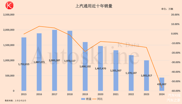 2024年,上汽通用连续第7年销量下滑,且是下滑幅度最大的一年。全年仅销售43.5万辆,同比下滑56.54%,较2023年的100.1万辆,减少近57万辆。放在以前,很难想象,拥有凯迪拉克、别克、雪佛兰三大品牌的上汽通用,会沦落至此。