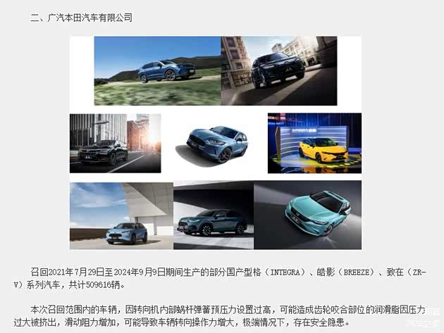 广汽本田汽车有限公司召回2021年7月29日至2024年9月9日期间生产的部分国产型格(INTEGRA)、皓影(BREEZE)、致在(ZR-V)系列汽车,共计509616辆。