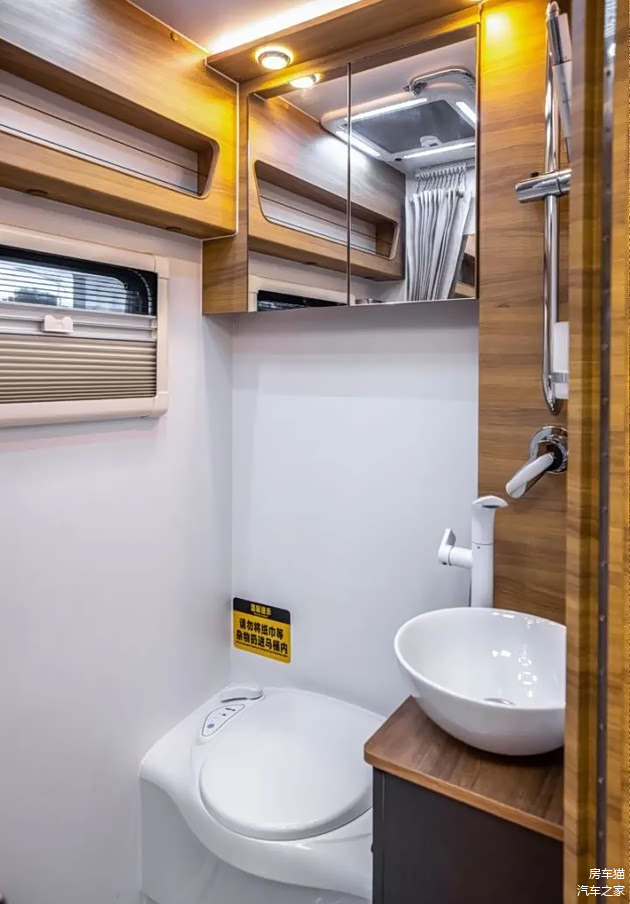 卫生间采用干湿一体式设计,内部配备有房车专用抽拉马桶、淋浴系统、换气扇、陶瓷面盆、储物柜、淋浴花洒等卫浴设施,确保用户在旅居过程中享受舒适便捷的卫生体验。外侧还配置有大尺寸穿衣镜,视觉上延伸了车内空间。