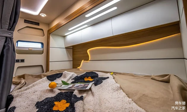 车尾为横床布局,将拓展结构展开后,床铺尺寸可达1200×2200mm,床铺上方配置有储物吊柜。床铺下方的舱门直通车尾的贯通式储物舱,方便用户拿取行李物品。床周还配置有阅读灯、充电接口、床帘、氛围灯带等便利性设计,保障用户旅居睡卧的舒适性。
